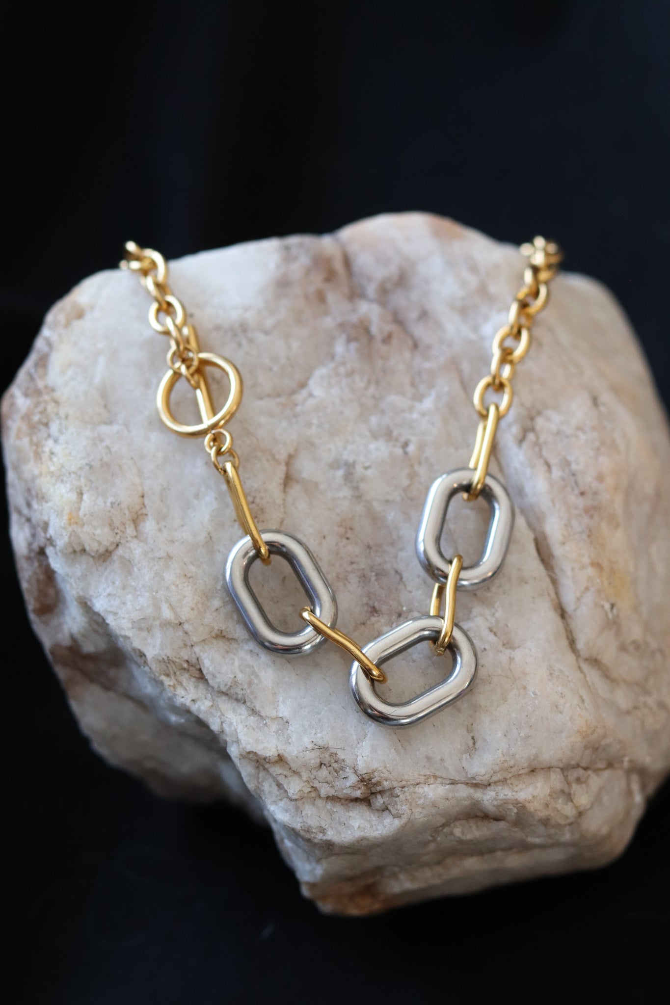 Designed with polished silver oval links anchored by a gold chain and toggle detail, this piece delivers effortless mixed-metal styling. No need to choose between gold or silver — this necklace does both.