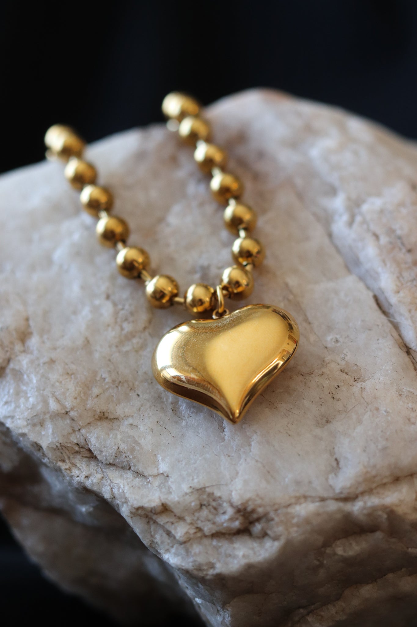 Featuring a sculptural puffy heart pendant suspended from a bold ball chain, this piece blends softness with strong, modern styling. The structured chain adds edge, while the heart keeps it timeless and romantic.